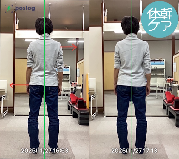 姿勢を確認すると、明らかな体幹の傾きと軸の不安定さが見られました。